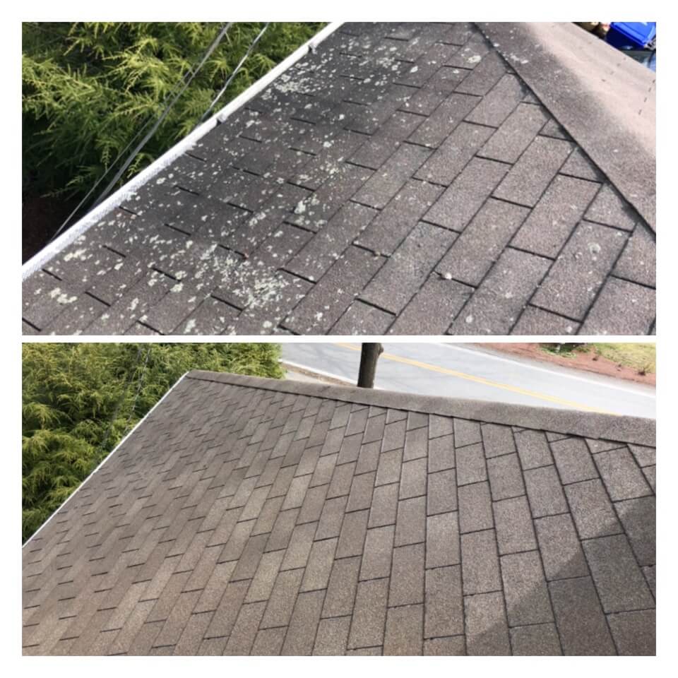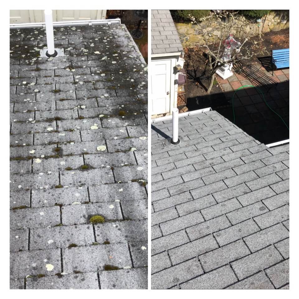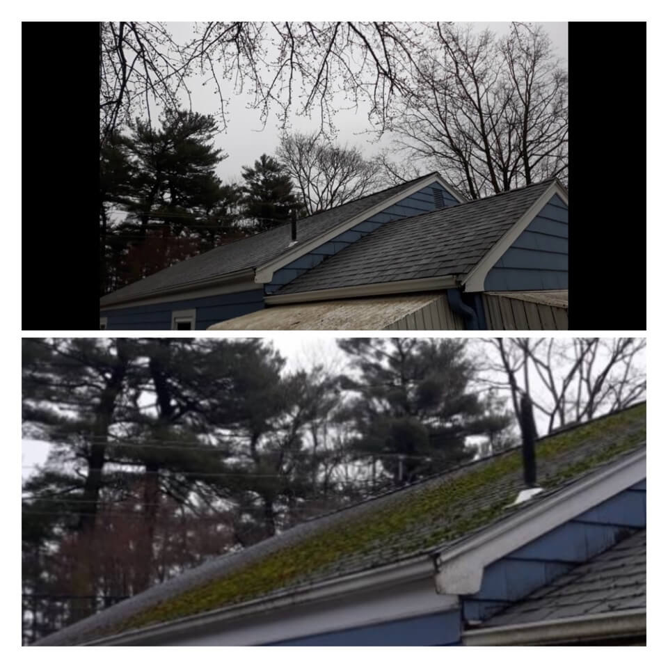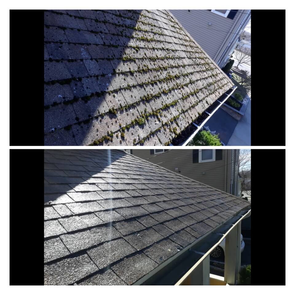 HiCleaners is the most experienced company in Weymouth, MA that deals with roof washing and roof soft washing. All of our employees are trained to recognize precise solution mixing ratios to provide you with the safest and most effective soft washing service. Roofs are a commonly neglected part of a house due to the fact that most people don’t have ladders to access it, so it is very easy to just leave it alone and forget about problems that may start to arise. Just like many home owners, discoloration and small bits of moss on a roof can be overlooked because of the misconception that it is just aesthetic. However, it isn’t just aesthetic, the moss slowly lifts the granules off the shingles which in turn shorten the life of the shingle. The moss also spreads, just like any bacteria if it is left alone for too long, it can quickly become a problem that spirals out of control. Call HiCleaners for a free quote, we only use the most advanced eco-friendly solutions and equipment to make sure the job is done right, for the safety of the employees, your plants, grass, pets, and children.