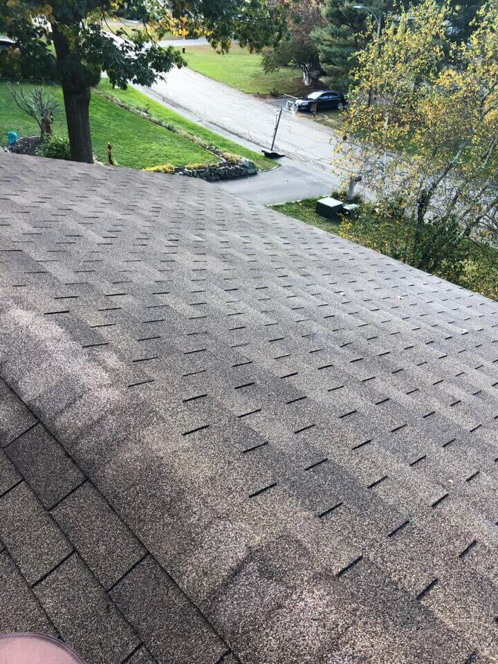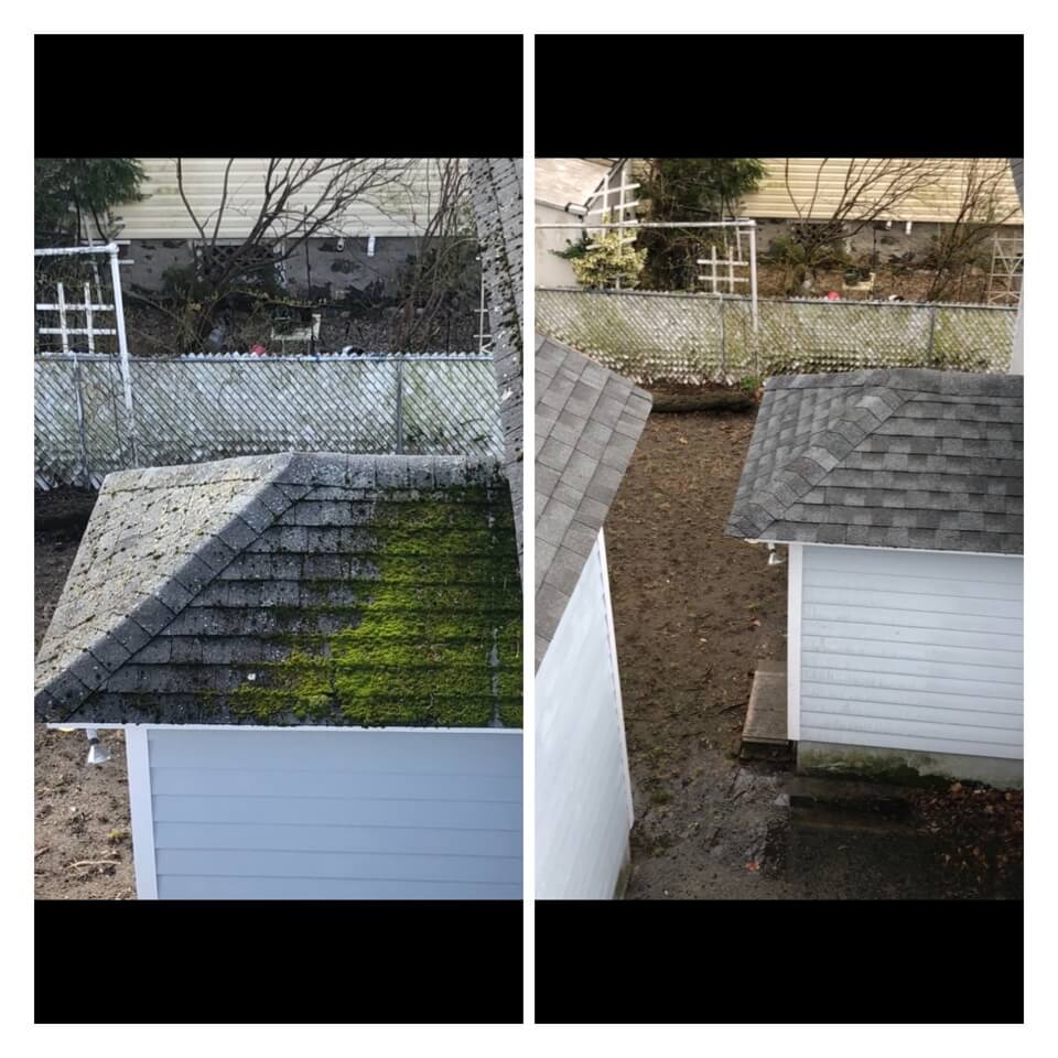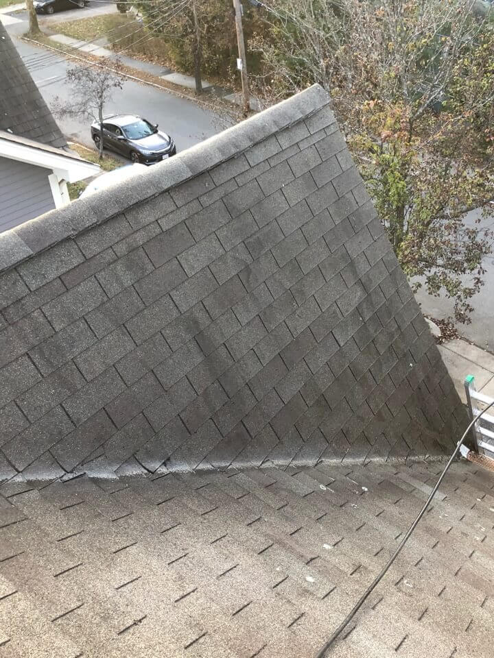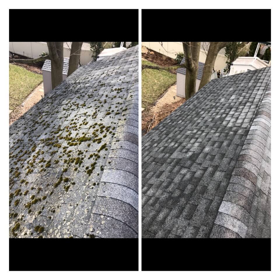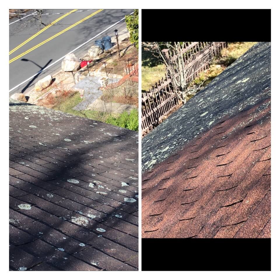 HiCleaners is the most experienced company in Weymouth, MA that deals with roof washing and roof soft washing. All of our employees are trained to recognize precise solution mixing ratios to provide you with the safest and most effective soft washing service. Roofs are a commonly neglected part of a house due to the fact that most people don’t have ladders to access it, so it is very easy to just leave it alone and forget about problems that may start to arise. Just like many home owners, discoloration and small bits of moss on a roof can be overlooked because of the misconception that it is just aesthetic. However, it isn’t just aesthetic, the moss slowly lifts the granules off the shingles which in turn shorten the life of the shingle. The moss also spreads, just like any bacteria if it is left alone for too long, it can quickly become a problem that spirals out of control. Call HiCleaners for a free quote, we only use the most advanced eco-friendly solutions and equipment to make sure the job is done right, for the safety of the employees, your plants, grass, pets, and children.